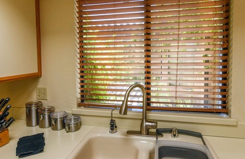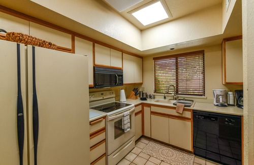 The en suite bathroom has a large tub & separate shower. Second bedroom is in a private hallway away from the great-room, with a queen size bed. Both bedrooms have access to a separate fully enclosed patio, which is great for letting the dogs out or just relaxing in complete privacy. Large picture windows in the great-room look out onto the mountains and golf course. The patio fronts onto the golf course, but is shielded from direct view of golfers by shrubbery & a small rise. The kitchen is fully equipped with pots, pans, dishes & utensils. Outdoor BBQ, table & chairs provided for outdoor dining. There is also a fire pit.