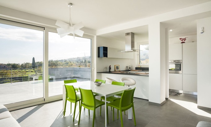 This modern-style villa is composed of two floors, finished at the beginning of 2017 to the highest standard; there are priceless features such as wide sliding glass doors, teak flooring for the sleeping quarters, pearl mosaics in the bathroom, a large stone shower and a wood burning stove, all made by the finest Italian companies, as well as a large and functional kitchen with a breakfast bar.