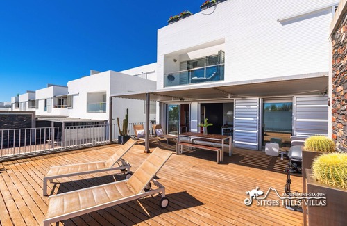 A delightful designer apartment with huge terrace, full A/C and fantastic communal swimming pools.The apartment is a 10-minute walk from the sea with low rocky cliffs and small coves for swimming. A large sandy beach with cafe is only a 15-minute walk.Apartment Casa Del Mar is a beautiful designer apartment, close to the sea, fully air-conditioned and located within an exclusive private complex with superb communal swimming pools and gardens.The apartment is a 10-minute walk from the sea with low rocky cliffs and small coves for swimming. A large sandy beach with cafe is only a 15-minute walk.The complex of Casas Del Mar has been designed by prize winning architects and is situated on a hillside overlooking the Mediterranean Sea between Sitges and Vilanova. The development has been meticulously built to the highest specifications and offers 24 hour controlled security access.Despite its quiet location, Casas Del Mar is an easy 5-minute drive to the bustling seaside resorts of Sitges and Vilanova with their abundance of boutiques, cafes, bars, restaurants and miles of golden sandy beaches. The world famous and cosmopolitan city of Barcelona is just 40 minutes away, while numerous other world-class destinations are within an easy day trip.The nearby Vilanova seafront offers large golden sandy beaches with numerous attractions and activities such as a children's train, playgrounds, trampolines, volleyball nets, basketball courts and football pitches. There are also plenty of restaurants and beach bars.ACCOMMODATIONApartment Casa Del Mar is a bright, attractive and contemporary style 3-bedroom apartment enjoying partial sea views from the fantastic spacious terrace and benefitting from the use of two superb communal swimming pools. The decor is both chic and comfortable.The fully air-conditioned accommodation is distributed over two floors as follows;Entrance LevelThe apartment is located on the 1st floor of the building and can be accessed from either the street level or from the garage with private parking.The entrance opens into a hallway leading to a stylish and bright open-plan living room/dining area that has large doors onto an impressive wooden deck/terrace with views over the complex and out to sea.The living room is tastefully furnished with a large L-shaped sofa, TV and coffee table. The dining area has a dining table that comfortably seats 6 guests and is conveniently situated next to the kitchen.The kitchen is modern and fully equipped with 4-ring electric hob, built-in oven, microwave, large refrigerator and freezer, kettle, dishwasher, coffee machine, toaster and a coffee table.There is also a guest bathroom on this level.Lower FloorAll of the bedrooms and 2 full bathrooms are located on the lower floor and configured as follows;BedroomsBedroom 1 – double or twin beds (80cmx190cm x 2) with open wardrobe and access to terrace.Bedroom 2 – double bed with open wardrobes and access to terrace. (Bed 140cmx190cm)Bedroom 3 – master suite with double bed en-suite bathroom and access to a small terrace. (Bed 140cm x190cm)BathroomsBathroom 1 – shared between bedroom 1 and 2 – shower, washbasin & WC.Bathroom 2 – en-suite to master bedroom – bath with shower, washbasin, bidet & WC.Bathroom 3 – WC and washbasin on entrance level.GARDENS AND POOL AREAOne of the most appealing features of apartment Casa Del Mar is the wonderful large terrace with partial views of the Mediterranean sea. The terrace is stylishly furnished with comfortable seating, covered dining area and sun beds.The terrace offers the ideal space in which to relax in the sun, enjoy al-fresco dining or just enjoy a cocktail.There is also an additional terrace on the lower floor that can be accessed from all the bedrooms.The community area features a large main infinity swimming pool and an additional smaller pool. The attractive and spacious gardens surrounding the pool area are very well maintained and provide the perfect space for sunbathing and relaxing by the pool while the children enjoy themselves.There are sunbeds for guest use and also a changing room with toilets and showers for additional guest convenience.OTHER INFORMATION- Easy access from the back entrance from the street or from the garage. Providing easy access for disabled or wheelchair users.- Washing machine available on the lower floor for guest use.- Full A/C throughout.- Free WiFi available.- Central heating is available for out of season holidays if required.- Secure parking in the garage or plenty of street parking.- Small beaches within 10-minutes walk.- It is possible to walk to Vilanova town centre from Casas del Mar along the coast path. It is also possible to walk to Sitges but the terrain and distance makes it more demanding.We have an office in Sitges and are there if you need us at all!Car is highly recommended, although local taxis are available.Prices do not include tourist tax of 1.00 € / person / day.