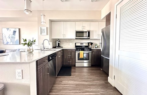 Brand new modern building and apartment just moments from CHOC and St. Joseph's with full amenities located directly in the heart of town! King Bed, Brand New Furniture, Fully Stocked Kitchen, building security, gated parking, pool, gym, work lounge, coffee bar, etc!