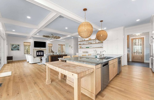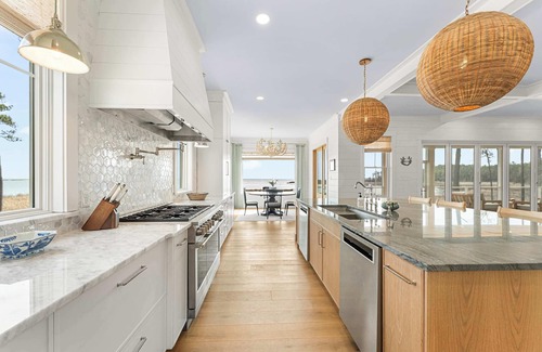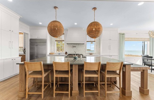 Inside, the home is thoughtfully designed for relaxation and connection. Vaulted ceilings and expansive picture windows flood the living spaces with light and create a seamless transition to the outdoors. The gourmet kitchen, equipped with premium appliances and generous prep space, is perfect for both casual meals and elegant dinners. Sink into the oversized sofas in the open living area or sip wine by the fireplace as the sun sets over the Bay.