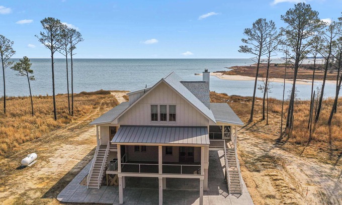 Welcome to Bayhouse at Bluff Point—a hidden coastal retreat nestled on eight private acres at the edge of the Chesapeake Bay. This elevated beachfront haven offers sweeping water views from nearly every room, blending modern architecture with the peaceful rhythm of the surrounding nature. From the moment you enter the long, wooded drive, you'll feel transported to a quieter, more refined kind of escape.