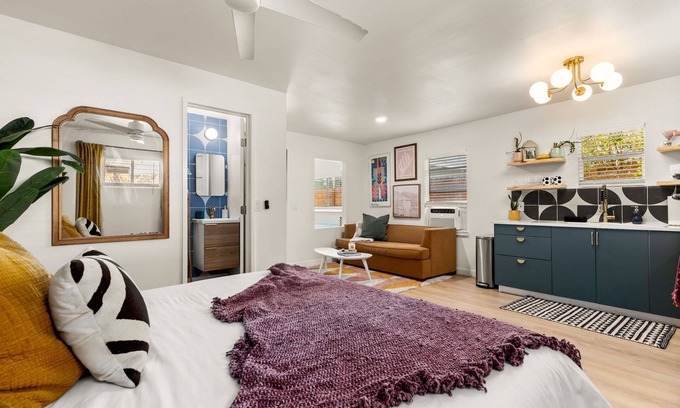The Bungalow is a 500 Sqft open-concept studio with everything you need for comfortable short-term or full-term living! The Studio Features a Casper King Bed, a large stand-in Shower, Open Concept Kitchen with a large fridge, In-Unit Samsung Washer & Dryer.