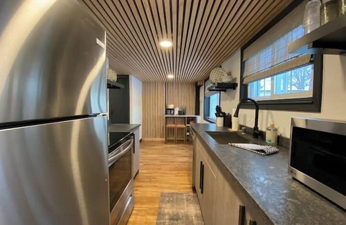 Modern, but not stuffy. The home retains the original character of the large wood beams and living room ceiling, doors and unique half-round door trim. The modern kitchen makes efficient use of space and the coffee bar adds a welcoming and luxurious touch. 3rd bedroom features a sleeper couch and a modern workspace - perfect for working remotely while enjoying your stay. Full bath features tub/shower. Laundry is accessible to guests for your convenience. Front screen porch and large backyard with patio add enjoyable outdoor spaces. Off street parking for two cars.