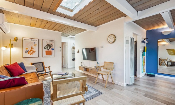 Get ready to relax in this charming modernly-designed home with wood ceilings and skylights, a luxurious respite for the traveler with gym (Peleton bike) and office desk. New kitchen with stainless appliances and gas stove. Two bedrooms with large closets and queen beds. Bathroom is a standing shower with a bidet toilet. This is a beautiful duplex in a gated property surrounded by mature trees.