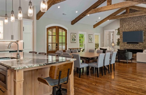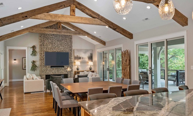 This newly constructed, fabulously decorated, Contemporary Woodland Lodge has 4 King Bedrooms and one Queen. The 150 year-old, hand-hued, reclaimed wooden Carolina mill beams dominate the huge open floor plan. With it's 17 foot ceilings, the Great Hall serves as the Kitchen, Dining Room, and Living Room with a 75" 4K TV over the remote controlled gas fireplace (fall and winter only). Enjoy all of it by setting the mood with your favorite music across the entire house (and the deck) with our accessible Sonos sound system.