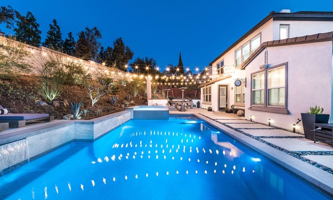 Have fun with the whole family at this stylish place and enjoy the gorgeous backyard with its own private pool, spa, market lights, and fire pit.