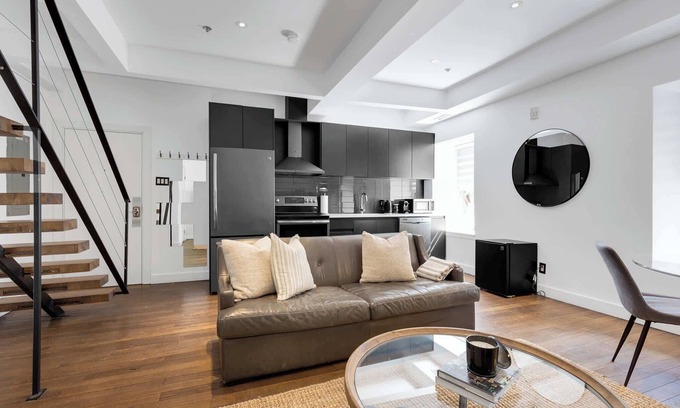 Experience Old Montreal in this one-of-a-kind split-level loft designed for comfort, style, and unforgettable moments. Wake up to light streaming through tall heritage windows as you gaze out onto the lively cobblestone street below—right in the heart of the action.