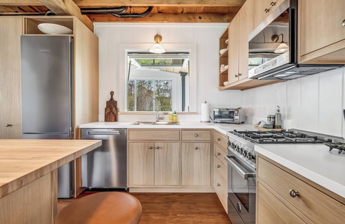 Inside, you’ll find king and queen bedrooms, two luxurious full baths, and an open floor plan anchored by a sun-drenched living room with a fireplace. A bespoke kitchen with a generous island invites leisurely cooking and conversation. Outdoors, gather around the fire pit under the stars or grill up a feast in the fresh coastal air.