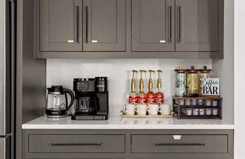 → Coffee Bar w/ K-Cups + Syrups Provided