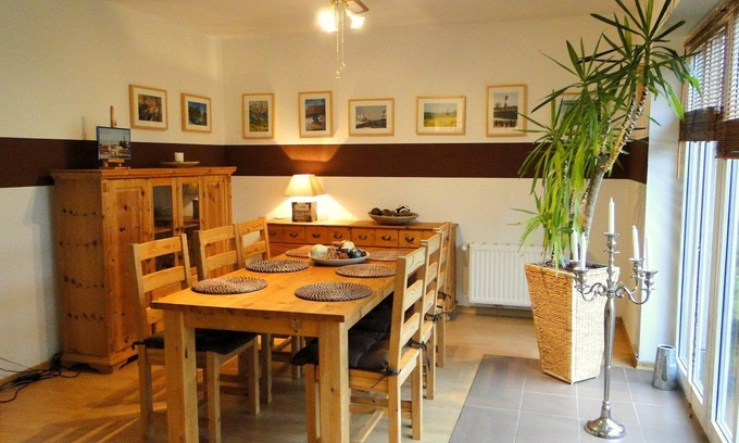 The bright and modern furnished apartment scores not only with its extensive facilities, but also with a beautiful outdoor area. The large garden (for shared use) has a lawn for sunbathing and the sunny south-facing terrace, which is exclusively available to you, beckons with all amenities. Make yourself comfortable here with a cool drink during a long day of sunbathing or relax after a long day by the sea for a delicious dinner outside. In addition, there is a lockable garage for shared use for the duration of your holiday, where bicycles can be parked for beautiful tours along the idyllic Schlei or sports equipment can be parked. There is also a reserved parking space on the property of the house.
