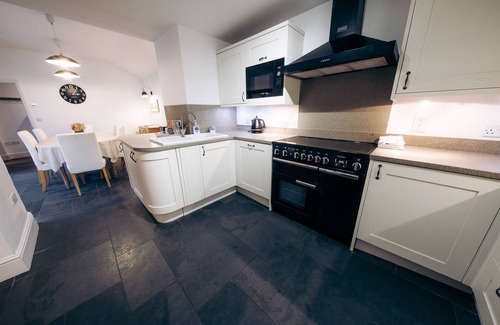 Kitchen/dining area which is open plan and well equipped with dishwasher, microwave, fridge/freezer, range cooker, washing machine, tumble dryer and table with chairs where guests can enjoy supper whilst looking over the garden. Bi-folding doors let the outside flood in and provide access onto the terrace which is ideal for alfresco dining during the warmer months.