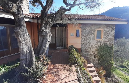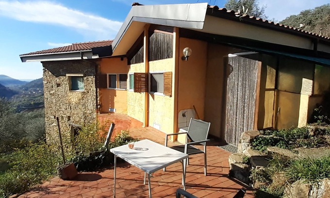 Detached bungalow on 4000 m2 olive grove, with beautiful view over medieval village Dolceacqua with castle (Liguria / Imperia) and sea (10 km) in the maritime Alps. Situated on the flower Riviera near Ventimiglia & Bordighera, near San Remo and the Cote d'Azur: Menton, Monaco & Nice.