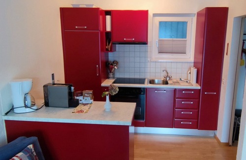 Our small holiday home has two flats, the upper one is available for rent. It is ideal for two, maximum four holiday guests. The holiday flat is reasonably priced, as you bring your own bed linen and take care of the final cleaning. It is practically furnished and fully equipped to ensure you have a carefree stay. The living room is furnished with a dining table, four chairs, two upholstered armchairs that function as single beds, a side table, wardrobe and a TV with satellite reception. The kitchen has a ceramic hob, oven, fridge and various coffee machines as well as a raclette and fondue set - everything you need for culinary delights. The bedroom has two single beds, a wall-mounted wardrobe and a chest of drawers, while the bathroom with two washbasins, WC and shower leaves nothing to be desired.