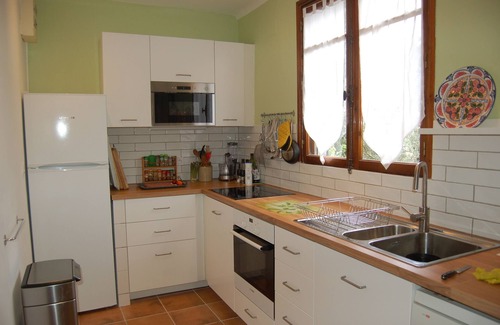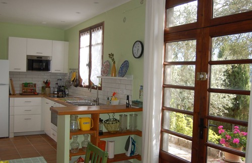 The main room is a spacious open-plan L-shaped kitchen/dining area with French windows facing the shaded front terrace with lovely views of the village. The kitchen area is modern, fitted and well-equipped with built in electric oven, induction hob, double sink, a large fridge/freezer, dishwasher, microwave, blender/mixer, coffee machine, toaster and electric kettle. The terrace at the front has a table and chairs for with views of the village.The dining area has a long table with 8 chairs (seating for 10) and a wood-burning stove for autumn and winter and electric radiator.