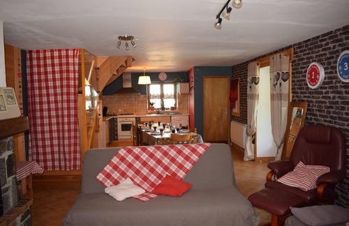 traditional construction, large room on the ground floor where there is a chalet atmosphere with its fireplace and wooden decorations. 3 attic bedrooms upstairs with parquet and pine paneling. courtyard, garden and airlock forming ski room