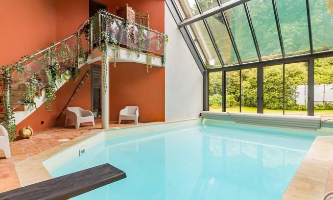 Detached house. Living room with wood stove (wood provided from October to March). TV, Internet, Bluetooth speaker. Equipped kitchen open to living room (gas hob, oven, microwave, dishwasher, refrigerator with freezer). Wc. Bedroom 1 (160x200 bed) with private bathroom (sink, walk-in shower). Upstairs, landing, bedroom 2 (140x190 bed) with private bathroom (sink, shower) and miller's ladder giving access to a mezzanine niche with an extra bed for 1 person. Baby equipment on request. Aerothermal heating included. All charges included. Sheets and household linen provided. Beds made on arrival. No washing machine but the owners offer a laundry service on request. Cleaning service at an additional cost. Heated indoor swimming pool (8x5m) shared with the owners (from May 1st to October 1st). Private terrace with garden furniture bordered by an ornamental pond. Deckchairs. Barbecue. 4-hectare wooded park shared by the owners. Unfenced grounds. Parking. Like a large ship set in a clearing, this imposing 1980s building looks out towards the sea and the harbor. A love at first sight enriched with a good dose of courage and a touch of madness, here are Nolwenn and her family, owners of this wooded estate and ready to bring this magical place back to life! They invite you to enjoy the comfortable, fully renovated and redesigned duplex and to share the magnificent indoor pool and its incredible glass roof that separates the two houses. From the pool, the sea view is remarkable and on the other side, it is a true green tableau. When the rhododendrons are in bloom, the setting is sublime. One bedroom per level, each with its own bathroom, allows couples to enjoy very preserved privacy. This beautiful green setting borders the Cherbourg golf course (9 holes). You can easily reach Tourlaville via the beautiful Château des Ravalets and reach the nearby coastline.