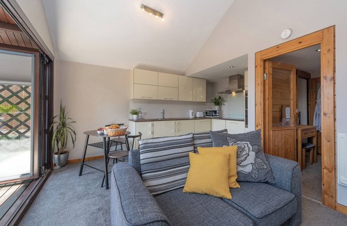 The One Bedroom Lodge with its own private HOT TUB and garden, is set within the grounds, has an outdoor feel to it, containing a large lounge/kitchen area, bedroom and ensuite shower room. A fully fitted kitchen, flat screen TV and free WIFI, quality furniture, outside patio with furniture and views over the garden, best place to watch the sun set. For those wanting to spend a relaxing few days this is a great choice.
