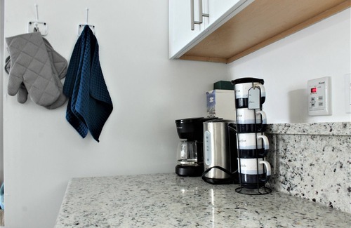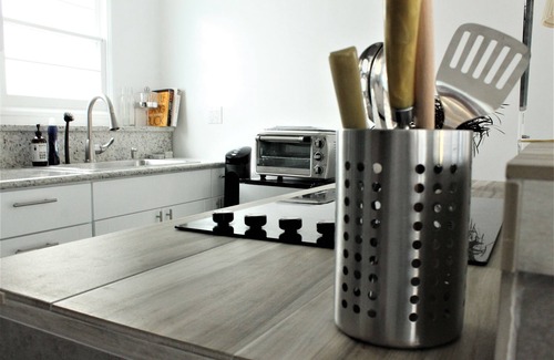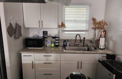 Guests will have full privacy as they relax in this peaceful space. There is a driveway with both pathway and stairs that leads from the street to the back guest home. The guest home can comfortably accommodate up to Three guests -- 1 queen sized bed (sleeps two) and 1 leather sofa (sleeps one). The bathroom has a stand-up shower, toilet, and sink, along with complimentary shampoo/conditioner, towels, and other accessories with one step to get into bathroom, and another step to access the toilet. The kitchen space has granite and porcelain countertops with island space for work or eating, as well as an electric cooktop with hood vent, stainless steel appliances (toaster oven, kettle, coffee pot, mini-fridge, etc.), and table ware. In addition, the space includes cabinet space, dressers for clothing, USB charging stations, a wall-mounted 4K HDR flat screen TV (DirecTV Satellite, Roku, Amazon FireStick, etc.), and Wi-Fi.