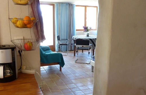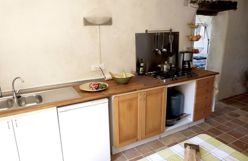 Via the terraced garden you enter the combined living room and bedroom with a comfortable double bed. This area merges doorlessly into the kitchen. A sleeping alcove is separated from it. Behind it is a bathroom, toilet, bidet and a washing machine. The rooms have underfloor heating, convection heating (gas central). Size 54 m2. Suitable for up to 4 people. The gravel terrace is their second living room and has sufficient garden furniture and a grill. In the warm season, you can enjoy the shady fig trees between lavender, rosemary, sage and thyme in our garden. The view sweeps endlessly over the hills and valleys of the changeable provinces and the nearby village Gignac.