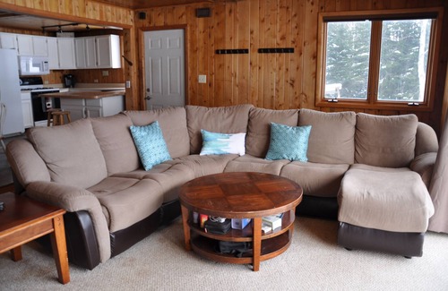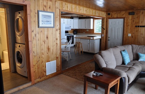 Our 2 bedroom home features a king bed and daybed with trundle in the lakefront bedroom, a queen bed in the second bedroom. Bathroom has tub and shower, and a washer/dryer is located in the hallway. Kitchen and living room are an open concept with spectacular views of Devil Track Lake. High speed internet is available in also television.