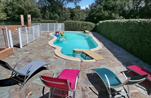 The Cocoonr/Book&Pay agency offers this villa with swimming pool for rent near the sea and Porticcio, the 140 m² accommodation can comfortably accommodate 10 travelers. The fully air-conditioned villa features an entrance hall, a fully-equipped kitchen, a large living room with a sofa that converts into two single beds, 4 bedrooms including one with a desk and one with air conditioning, and a large bathroom with corner bath and shower. You'll also enjoy the private swimming pool and 1220 m² enclosed garden. Bed linen and towels provided. We're waiting for you!