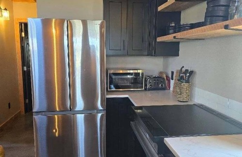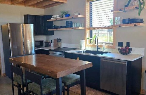 Inside, the main level welcomes you with a warm, open-concept living space perfect for relaxing after a day of hiking or fishing. The fully equipped kitchen features sleek Samsung appliances, a coffee bar, and seating for six—ideal for sharing meals and planning your next day's adventures. A smart tv and fast internet service provide modern connectivity. The king bedroom offers a restful place to recharge and includes ample space for your travel gear. The bathroom features a step-in shower and unique artwork for a refreshingly Western touch. You'll also enjoy the convenience of a full-sized washer and dryer to keep your gear ready for the next adventure.