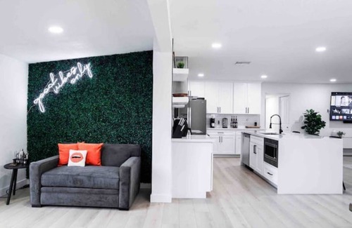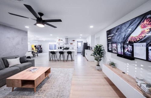 Enjoy the sun all day long from one of the chaise lounges. Do some grilling, take a dip in the heated pool and spa, play some outdoor games like Giant Connect Four, Corn Hole & Mini Golf, Axe Throwing OR play some vintage arcade games inside! Families or Groups will love cozy living room with plenty of seating and beds to sleep up to 9 people! With the fastest Wifi, Smart Home & TV's, you won't want ever want to leave! This house is stocked with complimentary coffee & tea bar, outdoor BBQ, Pool Toys, Pack n Play, high chair, pet friendly turf.