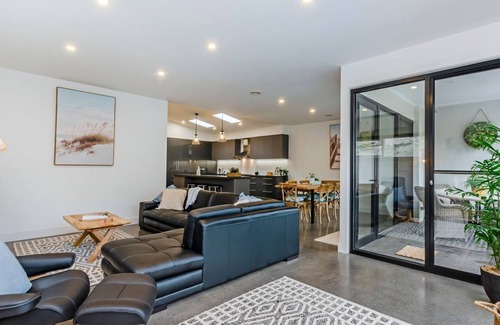 Head inside to the open plan living, kitchen and dinning room. This sleek and beautifully finished area will put you at ease the moment you walk in. The living area has a large TV and luxurious L shaped leather sofa just made for evenings in front of a good movie. Or if you are home alone curl up on the lounge chair with a good book in front of the floor to ceiling windows that look onto the garden area. In the summer close the blinds to hide away from the heat, or in the winter enjoy the afternoon sunshine. There is a selection of books and games for your use during your stay.