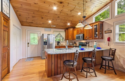 Acres of private park like atmosphere with this secluded gem! Enjoy peace, quiet and nature all at your fingertips! Far enough out of town for that "country" feeling, private end of road property with lots of yard and a stream for the kids to play in or relax and listen to the water bubbling by. Once inside the one level cabin you'll love the cozy feeling it offers, with the large great room offering comfortable leather furniture with a pull-out sleeper sofa, flat screen TV, foosball table, lots of board games, internet and a gas fireplace. The spacious kitchen offers granite counters, and everything needed to cook a full meal or grab a quick snack. Guest Bedroom and Master Bedroom both offer Queen beds. Full guest bathroom and a full master bathroom with double vanity. Arcade game too in guest bedroom. Step out to the back porch and take a dip in the hot tub while watching the deer and turkey. Rocking chairs on the front porch give you the chance to gaze over the whole property. Two charcoal grills, picnic tables, fire pit area, Corn hole boards and tether ball. Plus explore the property and fall in love with nature's beauty.