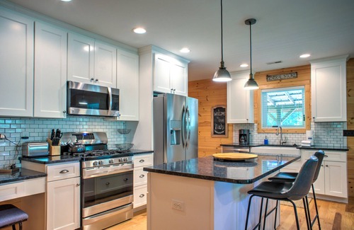 Featuring a large stone patio with an outdoor fireplace and dining area, Dillingham Dacha is a true home-away-from-home where you can cozy up in the living room and watch movies on the flat-screen TV with Roku and streaming internet service. The home's fully equipped kitchen allows you the ease of making your favorite home cooked meals while on vacation, plus there's a charcoal grill that's ideal for family cookouts.
