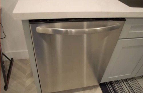 Modern conveniences include central air conditioning, a spacious living room with a 65-inch smart TV, and a fully equipped kitchen with a dining island. Guests will enjoy additional amenities like filtered drinking water, a washer and dryer, a work desk, and high-speed internet access.