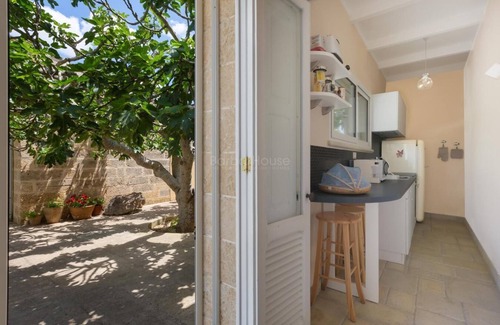 The kitchen and second bathroom a perfect blend of the interior with the exterior and bright thanks to large windows that lead to the view between aromatic and medicinal herbs, surrounded by the lush greenery of citrus. The kitchen also opens onto an outdoor dining area defined by prickly pear and old stone walls which together with the large fig tree supporting the tent sheltering from the hot sun.