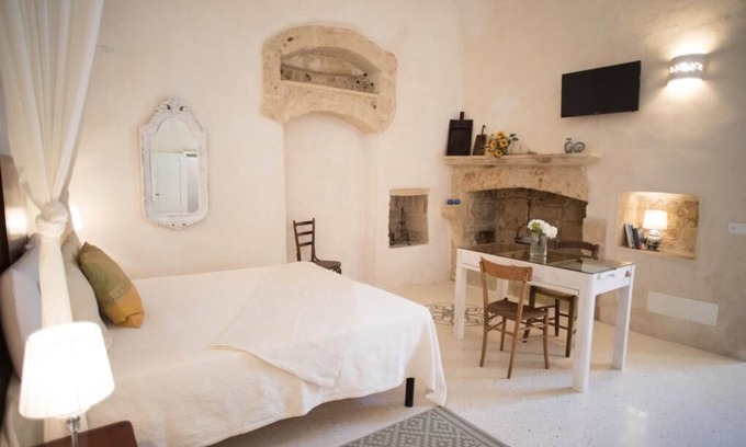 The historic residence NONNA CONCETTINA dating back to the early 1500s, is located in the oldest court in the town of Corigliano d'Otranto immersed in the alleys of the historic center. The architecture of the typical courtyard houses is characterized by the arrangement of a common living space, a sort of popular living room where, in the olden days, many families lived most of the day chatting, embroidering and helping each other with household chores. Ideal for those who love to travel and want to experience the most intimate local traditions to discover the beauties of the Salento area and sea. The small mansion, finely restored and furnished, respects the architectural techniques of the time with the ceilings characterized by the barrel vault in Lecce stone, as well as the large fully functional fireplace. The furniture once again immerses the visitor in the most intimate and enchanting Salento tradition for typically historic furniture. It has a comfortable double bed, kitchenette furnished with everything you need, fridge, air conditioned room, TV, precious private bathroom located in a charming corner with large shower, hairdryer, courtesy line. All this to make our customers relive the atmosphere of the past, combined with the comforts of our days.