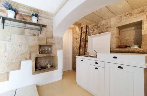 The historic Nonna Lucetta residence is located in a characteristic pedestrian street a few steps from the medieval Castello Dè Monti in the characteristic town of Corigliano D Otranto. The house is part of a typical courtyard house, that is, an independent residence overlooking the common atrium "court", in a romantic and reserved setting suitable for reviving the atmosphere of the past. The dwelling respects the architectural techniques of the time with the ceilings characterized by the star shaped vault in Lecce stone, and with a large fully functional fireplace. From the bedroom you can access a small private outdoor patio. The completely historic furniture has been finely restored preserving the typical Salento characteristics, allowing guests to immerse themselves in the most intimate and splendid local tradition. It has a comfortable double bed, kitchenette furnished with everything you need, fridge, large private bathroom with comfortable shower, air conditioned environment, hairdryer, courtesy line, TV.