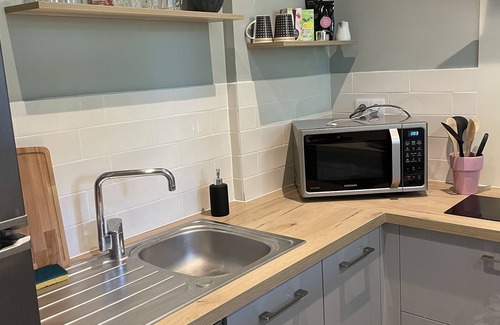 This 1-bedroom, 1-bathroom rental features a sofa bed and an office. Bathroom amenities include a hair dryer, towels, and toilet paper. The kitchen is equipped with an oven, a stovetop, and a refrigerator, as well as a coffee maker, an electric kettle, and a microwave. Other amenities include bed sheets, heating, limited housekeeping, and a dining table.