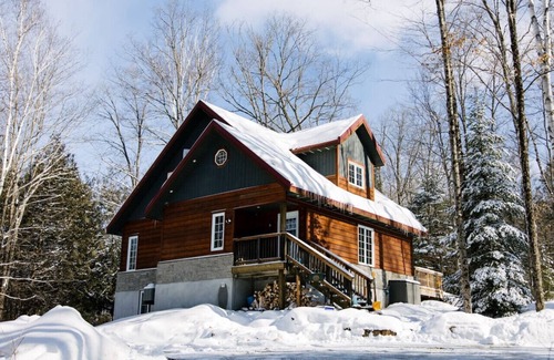 Lodge style cabin nestled in a 2 acre forest directly on Sir Sam's Ski & Bike. Enjoy the ease of ski-in/ski-out, snow shoeing, hiking or biking right from the beautiful deck which over looks an 8-person hot tub, 20' sauna and a unique firepit. In the summer take a short walk to Eagle Lake public beach and boat launch for fishing/swimming. Endless adventures near by like the Haliburton Forest, dog sledding, wolf center and so much more!