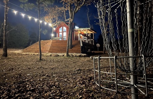 Dinosaur Valley Disc Golf course cabin rental. Rental of the cabin provides access (with signed waiver) to 18 hole private Disc Golf Course. This is a small cabin that can sleep 6 people. (2 queen, 2 full and one twin fold out couch) Cabin is rated at 399sq ft which does not count the two lofts. Large deck with partial cover. Also 2 additional RV spots can be made available on the property. The cabin is for sleeping and cooking. Go outside and enjoy the property and area