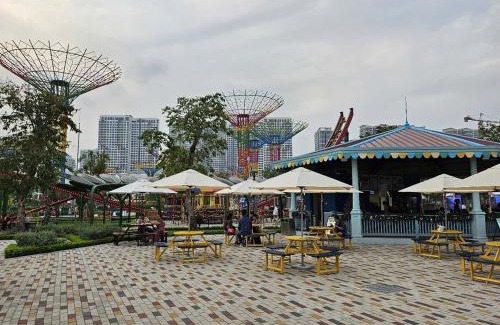 Offering a garden, Dinosaurs House - New apartment, Vinhome Grand Park-2BR,2WC, 5 guests offers accommodations in Gò Công. Complimentary Wifi is featured throughout the property and private parking is available on site. The pool features a water slide and pool views. This air-conditioned 1-bedroom apartment comes with a seating area, a cable flat-screen TV, and a fully equipped kitchen with a fridge. Guests can take in the views of the lake from the terrace, which also has outdoor furniture. The accommodation is non-smoking. Suoi Tien Amusement Park is 4.3 miles from the apartment, while Vincom Plaza Thu Duc is 5.5 miles away. Tan Son Nhat International Airport is 12 miles from the property.