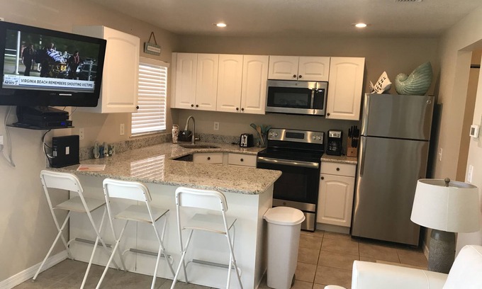 Gorgeous one bedroom oceanfront condo located in the heart of downtown Cocoa Beach. Walking distance to restaurants and entertainment. Recently remodeled with new appliances and granite counter top. Equipped with full size kitchen (has everything you need to cook), sleeper sofa, HDTV with cable in living room and bedroom, wifi, and central air conditioning. Enjoy relaxing on the patio with beautiful views of the ocean. Full size washer and dryer inside the unit.