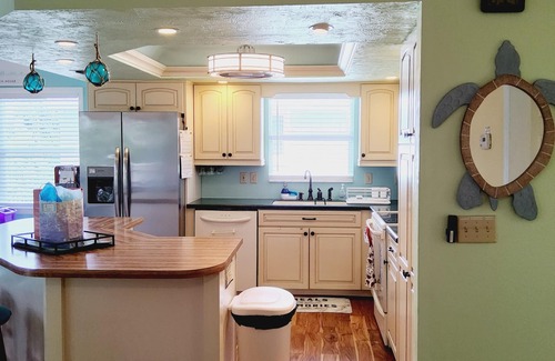 The main bedroom has a king size bed with storage as well as a large dresser and huge closet. The 2nd bedroom has 2 twin beds, dresser and big closet. The living room has a queen sleeper sofa. We supply all the comforts of home for short or extended stays. We have added a newer air conditioner, hardwood floors and new roof in 2022.