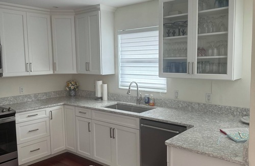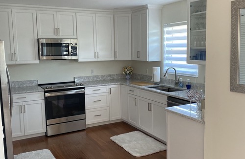 A full complement of dishes, glassware and cooking utensils fill the generous kitchen cabinets. Dishwasher, microwave, stove and refrigerator with icemaker make meal preparation easy. The newly remodeled kitchen with quartz countertops is adjacent to the dining area and sundeck, both of which have tables with seating for 6. The charcoal grill can be used on the patio or on the deck.