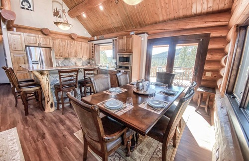 Built with full-sized premium logs, the upper levels of the home offer a quintessential high alpine feel. As you step into the cabin, you are greeted by a wall of floor-to-ceiling windows next to the large stone hearth of the great room fireplace, offering incredible views of the Mosquito Range - no matter the season! Sink into the large, leather couch for a good read, a fireside movie with those you love or just enjoy the wall-to-wall mountain vistas. The well-appointed kitchen offers ample counter space, state-of-the-art stainless steel appliances, and everything you will need to whip up your favorite meal. The dining area has a spacious table with comfortable seating for 6 and additional high-top seating for 4 at the bar.