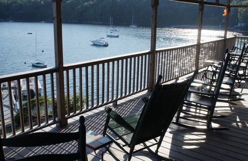 At the head of Linekin Bay, "The Mooring" is an eighteen-nineties shingle-style masterpiece overlooking a private dock and swimming area. The southern exposure of its wrap-around covered porch offers 270 degree views of the bay below.