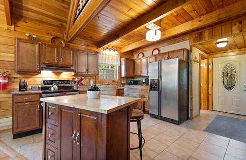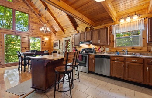 The kitchen is equipped with stainless steel appliances, including a refrigerator with filtered water dispenser and automatic ice-maker, dishwasher and coffee maker among standard kitchen appliances and cookware. A flat screen TV is mounted over an elegant gas fireplace, connected to DISH Network service. Plenty of comfy sofas with room for all. A cozy reading lounge in the open loft sets a peaceful tone for relaxation. Outside, there's a private hot tub behind the cabin, a wrap-around deck with an umbrella table and cushioned chairs, and an electric grill. A fire pit is also available in the yard. Access is easy for 2wd vehicles on paved roads and driveway connecting directly to the front door stairs.