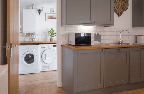 As you walk through the front door, you are immediately in the open plan kitchen/living room. Here is a large island, dining table for 4 and a refurbished kitchen fully kitted out with Smeg and Bosch appliances to make your stay effortless. Off here is the utility room, complete with washer and dryer too.