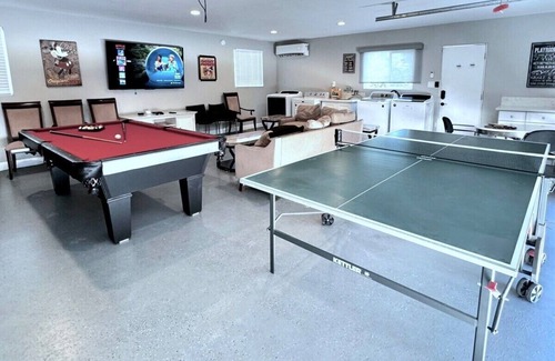 - Game room equipped with a pool table, ping pong table, 70-inch Sony Smart TV with Apple TV box, and living amenities.