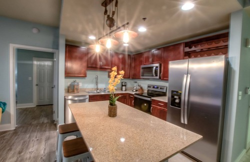 The unit has been beautifully decorated and offers the perfect setting for a beach getaway. You will find this spacious kitchen to flow perfectly with the open and spacious living room. The comfort of the fluffy furniture and the clean design will make you feel at home. The kitchen is very well stocked, it offers anything and everything you may need to cook a three course meal. the bunk area is secluded and has a private bathroom accessible right across. The master suite has the most comfortable bed and perfect shades to guarantee a good night sleep after a long day at the beach. The private master bathroom and extra large closet space complete the perfect ambiance for comfortable stay.