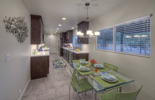 Ultra modern SCOTTSDALE SUNDOWN overlooks the premiere Starfire Golf Course and is what vacation dreams are all about! Well-appointed ranch style house with 4 bedrooms and 3 baths is designed to sleep 10 in absolute comfort. A private pool with optional heating offers the ultimate splash as well as exquisite moments of tranquility in sunny and sensational Scottsdale. The safe and charming neighborhood is located on a busy thoroughfare and traffic noise is possible when guests are outside.