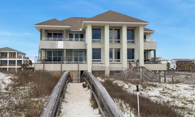 Welcome to Dixie Queen, one of the most iconic and requested luxury homes on Pensacola Beach. This stunning Gulf-front retreat boasts over 5,000 square feet of custom elegance with panoramic beach views, expansive decks, and premium finishes throughout. A private boardwalk leads directly to the sugar-white sand, while multiple levels of outdoor living spaces, including a private swim spa, offer some of the best views on the island.